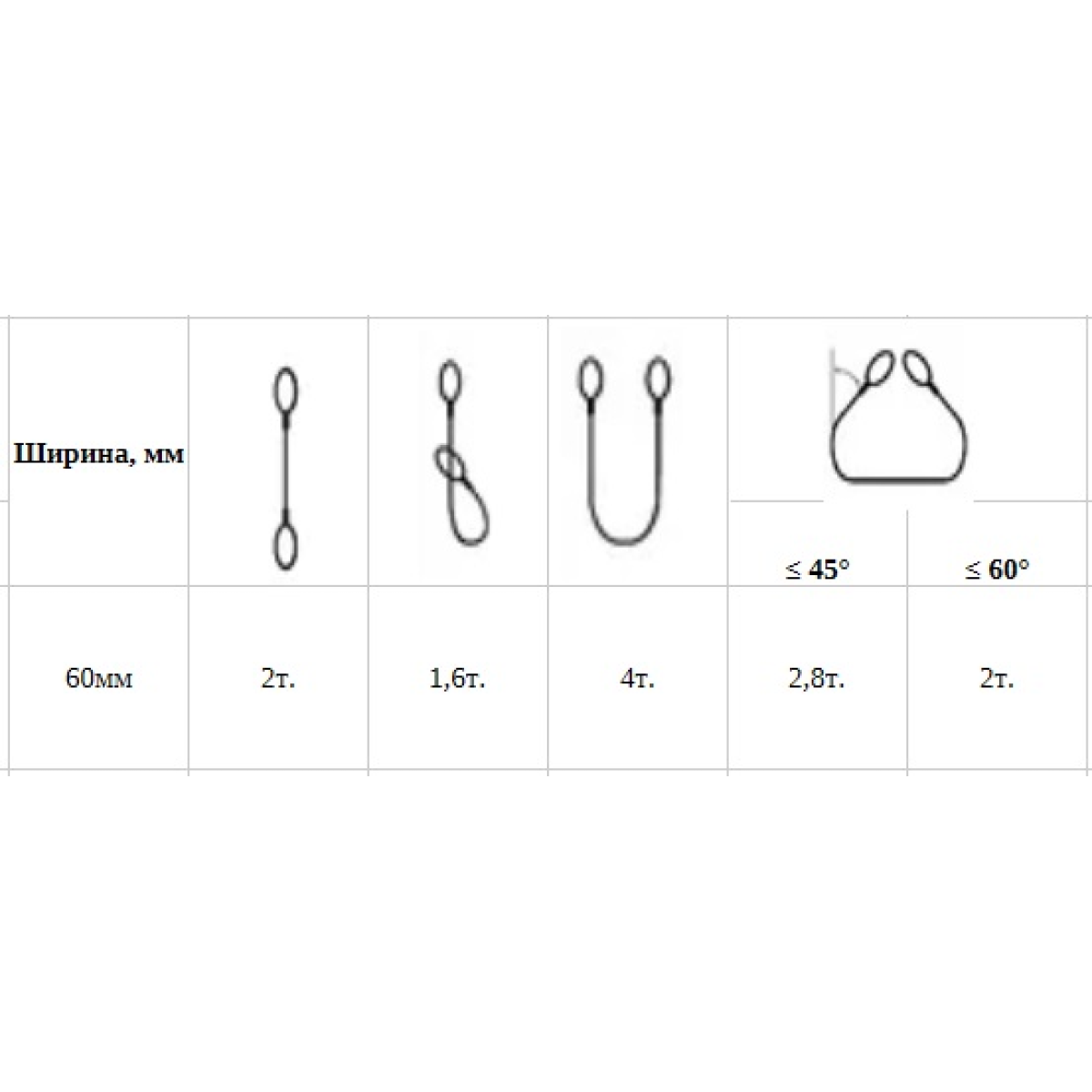 Важливо! Метод стропування і кут між умовною вертикаллю та тілом стропа мають вплив на несучу спроможність виробу. Зверніться до даних у таблиці для отримання точної інформації.